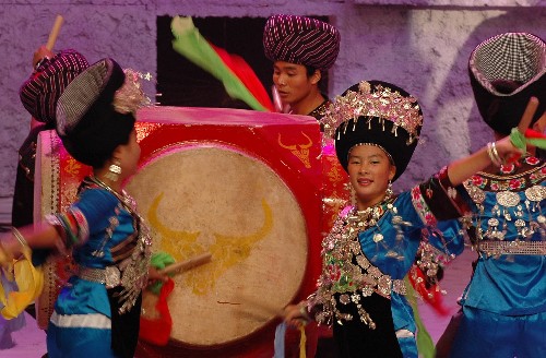 当日,松桃苗族演员表演花鼓舞。