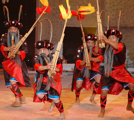 7月27日,黔南州苗族演员表演长衫龙芦笙舞。
