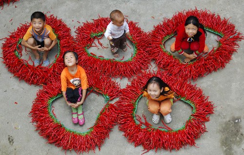 8月26日,贵州省平坝县天龙镇二官村的孩子们在用晾晒的辣椒摆成的红五环中玩耍