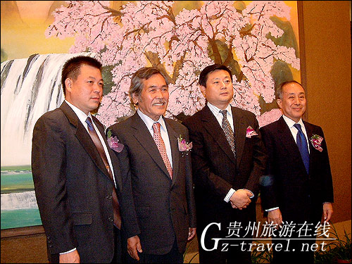 贵州省旅游局副局长傅迎春与日本丸山博先生、石塚健先生等在《贵州友好樱》前合影留念