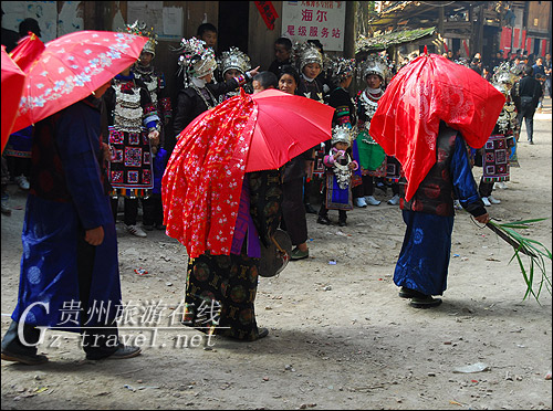 11月15日,牯藏节仪式--转场,牯藏头一边走,一边用树叶扫地,以示扫除邪恶、灾荒,保佑苗寨岁岁平安,五谷丰登。