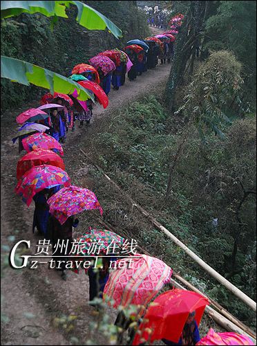 11月15日,牯藏节仪式--转场,一群老人在牯藏头的带领下,从起牯地出发,围着寨子转场。