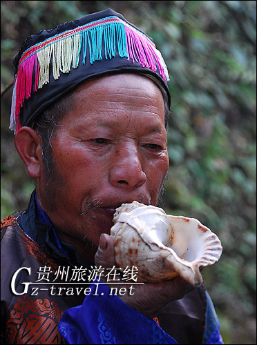 11月15日,一苗族老人吹响螺号,表示盛大而神圣的牯藏节开始。