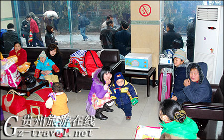 2月1日,50多年来罕见的雪凝灾害,在贵州大地肆虐已经20天。今天,贵阳地区又飘起了雪花,寒冷难当,然而,在贵阳新体育馆客车站的特殊旅客--母婴幼候车室里却暖意融融,一群可爱的婴幼儿童在母亲的带领下尽情玩耍,笑声朗朗。这是贵阳新体育馆客车站在雪凝凌冻天气袭来之时专为母婴幼旅客设置的空调候车室.充分体现出了客车站人文关怀。到上午10点30分,由于贵阳通往各地区的道路凝冻,几百辆客车一辆也没有发出。据客车站工作人员介绍,自贵阳遭遇雪凝凌冻天气20天来,车站每天都要派出百余人执勤,维持秩序。