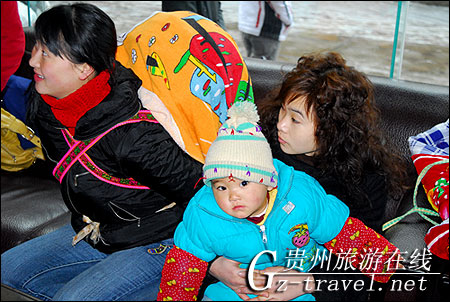 2月1日,年轻母亲们带着孩子在候车室候车。