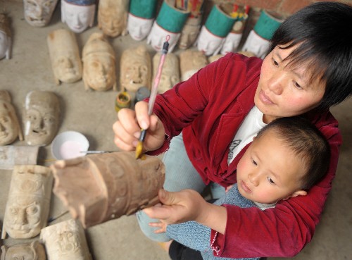 3月17日,广西河池市环江毛南族自治县洛阳镇平源李果场大河组的毛南族妇女谭秀香在为傩面具上色。