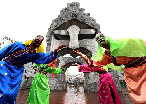 3月17日,广西河池市环江毛南族自治县文工团傩戏演员在县城文化广场表演傩戏。