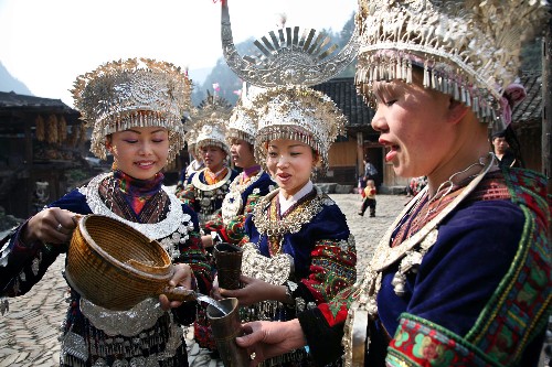 3月26日,苗族同胞往牛角杯中斟酒准备给游客敬酒。