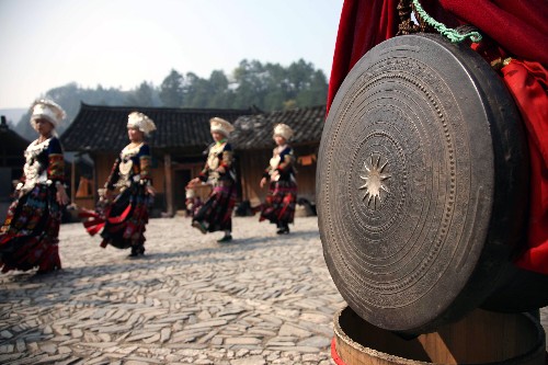 3月26日,苗族姑娘们围绕铜鼓表演原生态苗族舞蹈。