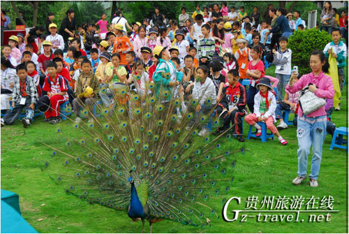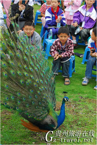 来自灾区的儿童在黄果树陡坡塘景区观看放养的孔雀。