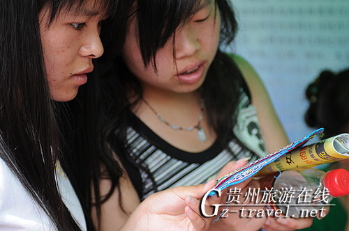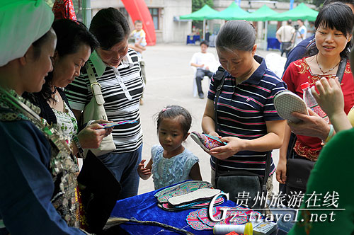贵阳市民在水族马尾绣展台前参观、咨询马尾绣工艺。