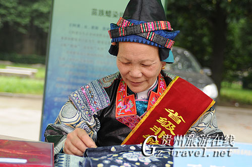 苗族老人王阿勇在展示丹寨苗族蜡染