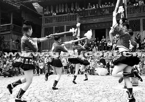 记者在寨门口看到,苗族姑娘在短短数十米的小路上摆好了12道拦路酒,据当地人介绍,12道酒代表对一年中12个月份的祝福,每位客人都必须喝了这12道拦路酒后才能进入苗寨。