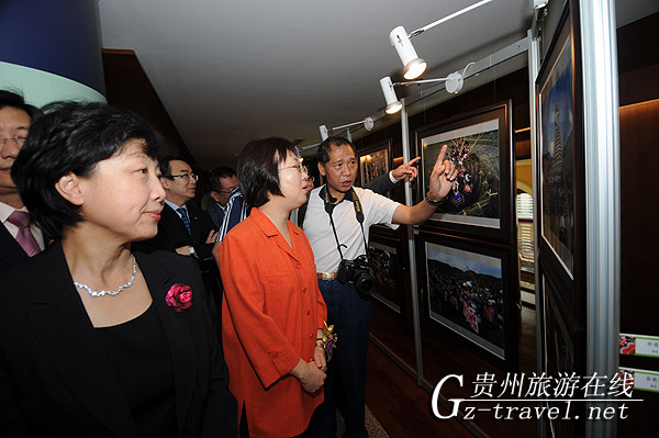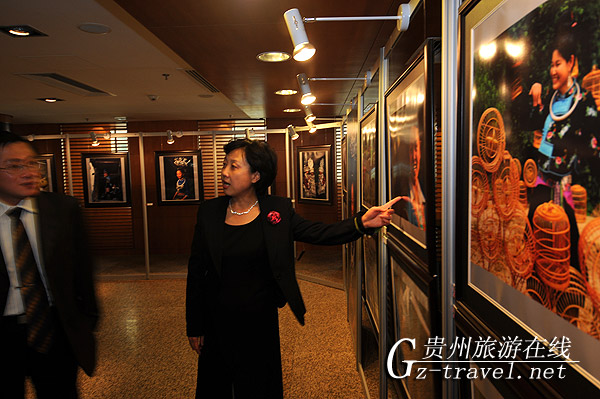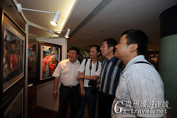 贵州省旅游局新闻中心主任欧阳昌佩(左三)观看展出的摄影作品