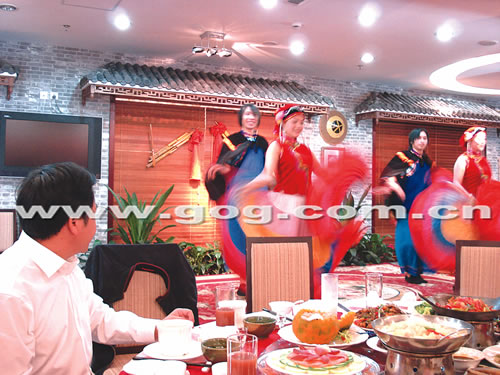 近年来,随着多彩贵州风在全国的热吹,贵州原生态民族文化不仅在全国叫响,而且走进酒店等饮食娱乐场所,解决了不少农村有才艺的少数民族青年的就业问题,又为餐饮等服务业添彩。图为北京市崇文区珠市口东大街的黔味轩,身着民族服装的贵州青年男女为就餐的客人表演民族歌舞。