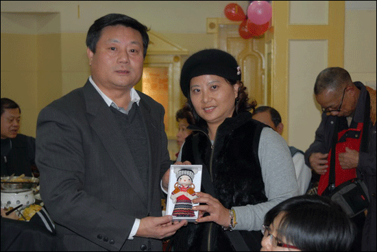 1月25日,贵州省旅游局局长傅迎春向台湾游客赠送小礼品--布娃娃。