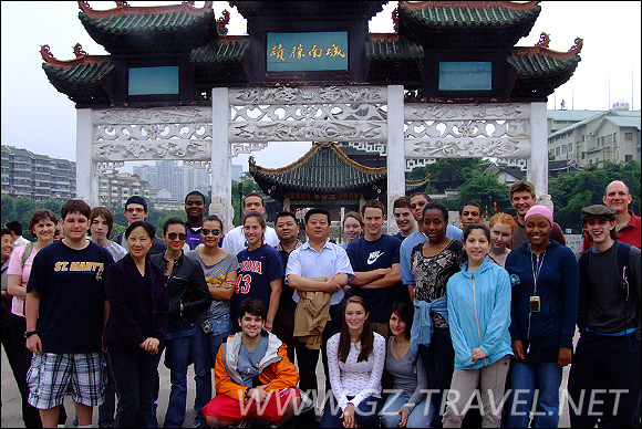 省旅游局领导与美国旅游团在甲秀楼前合影留恋
