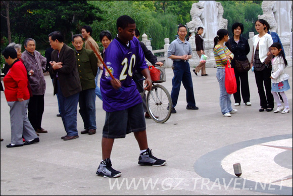 美国游客在参与市民的晨练-打陀螺
