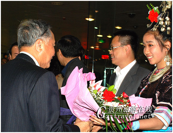 晚上9点,专机到达,台湾观光协会会长周庆雄等四十多位旅游业界的同行嘉宾刚下飞机,就受到贵州旅游同行的热烈欢迎,两岸同行相见分外亲切。