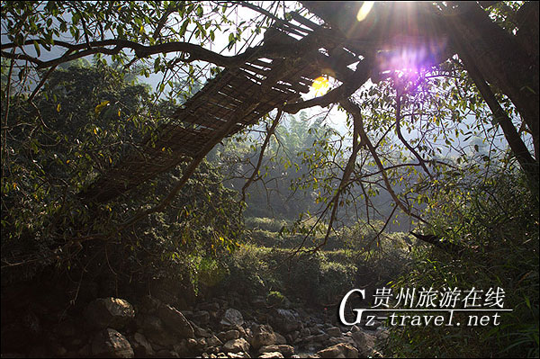 本网讯 在北盘江上游的盘县、普安县和水城县交界处的河流上,有一座建在树上的桥。这座桥因桥边的村寨而得名,叫毛虫竹杆桥,毛虫钢丝桥。