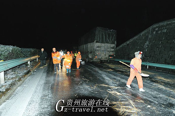 3日零晨气温已下降至零下8度,此刻的养护工人还在持续地撒盐,争取让滞留车辆尽快通行