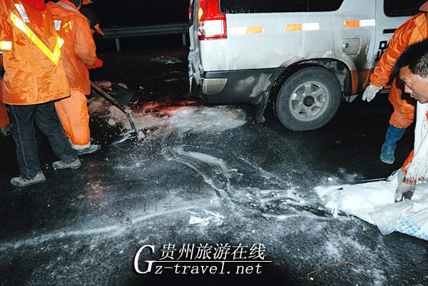 滞留车辆开车灯照明,让工人铲沙撒盐更有效地扫清路面积冰