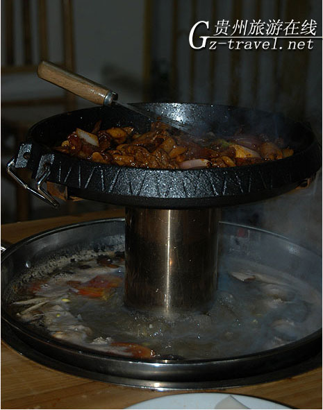 所谓的“幸福二重奏”就是上下两锅一起吃。上锅为烧烤锅,下锅为火锅汤锅。此种吃法在贵州很少见,有创意,很特别。 在上面的烧烤锅中可以把各种肉类和各种蔬菜放进锅里进行烧烤。口味可以选择,香辣、麻辣、酱香等口味都有。而且价格很便宜哦,肉类每盘10元,蔬菜类3——6元。可供烧烤的有牛肉、青红椒、洋葱、鸡皮、鸭菌、猪心、猪肉、耳块粑、臭豆腐等等。下锅是清润可口的火锅汤锅。有靓汤锅可免费享受(靓汤锅中的汤是用猪骨、鸡骨和鱼骨熬制);还有圆子汤锅,圆子是用鸡肉、鱼肉、猪肉、鸡蛋清混合而成,肉质嫩滑、口感鲜美,此汤中还加入了四种食用鲜菌使汤的味道更加鲜美。