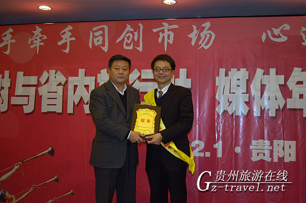 贵州省旅游局局长傅迎春(左)为海外旅行社销售冠军颁发证书