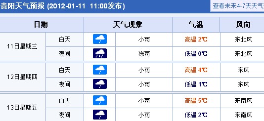 今天到明天,全省阴天有小雨,中部一线有雨夹雪,中西部地势高处有冻雨。13日,全省阴天有小雨,西北部地势高处及开阳等地有冻雨,东南部有小到中雨,西部边缘地区白天转多云。