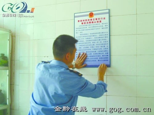 据了解,黄果树风景名胜区是国家5a级景区,作为我省对外的一张重要名片,已成为文化、旅游的一个重要窗口,为了维护景区的良好形象,保护广大消费者合法权益,黄果树工商分局特地在旅游旺季来临之前推出了餐前确认制度:在各家餐饮企业的醒目处悬挂《黄果树旅游景区餐饮行业餐前消费确认制度》宣传牌,并在菜谱和菜单上打印《消费提示》,告知消费者在就餐前,一定要确认价格,点菜单必须经其签字确认后方可下单,而一旦发现菜单价格与实际不符,消费者可拒绝付款,并向工商部门投诉。