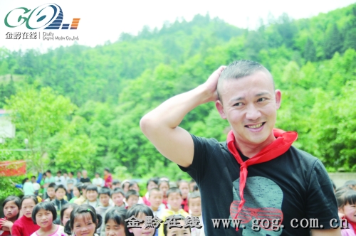 图为5月17日,在镇远县金堡乡绞巴小学援建无尘环保教室后,聂远和学生们进行交流。