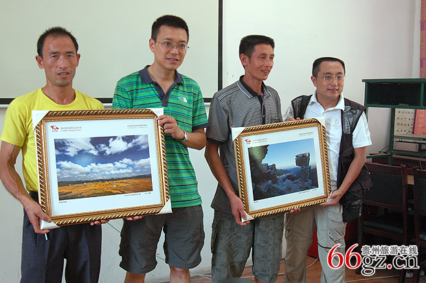 贵州省青年摄影家协会主席张驰(左二)、彭浩(右一)为清江村村民赠送作品