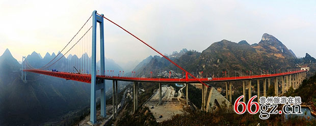 贵州坝陵河大桥,是跨度居“国内第一,世界第六”的大跨径钢桁梁悬索桥,跨越坝陵河峡谷,是目前国内跨度最大的钢桁加劲梁悬索桥。东塔高186米,西塔高201米,河谷两岸地势陡峭,地形起伏很大,河谷深达400至600米,坝陵河大桥东接壮美的黄果树大瀑布、西临三国索马古道、南毗神秘的红岩天书、北靠滴水滩瀑布,建成后将成为黄果树风景区的又一道举世瞩目的风景。