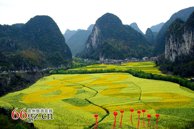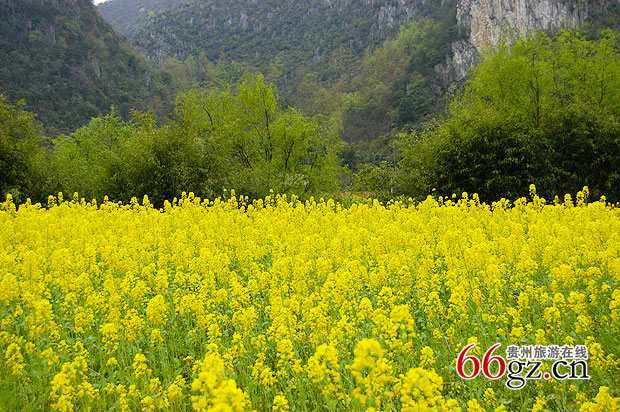作为国家5a级景区,安顺龙宫的景色自然非同一般,每年春天在那里盛开的浩瀚油菜花海,无非是“景”上添花,油菜花随着当地的喀斯特地貌来分布,层层叠叠,顺着地势蜿蜒伸延,构成了奇异的画面,满山遍野美不胜收。龙宫的油菜花因龙形图案而出名,各类植物套种的五彩巨龙匍匐在金色的大地上,美丽中透着霸气。而每年3月中旬举办的油菜花节期间,游客们可在龙宫大饱油菜花开眼福。