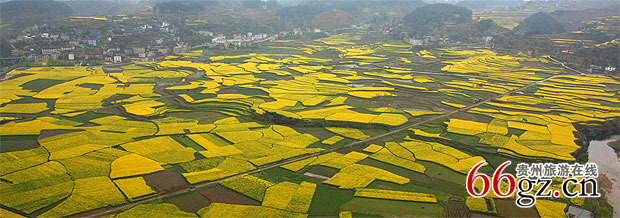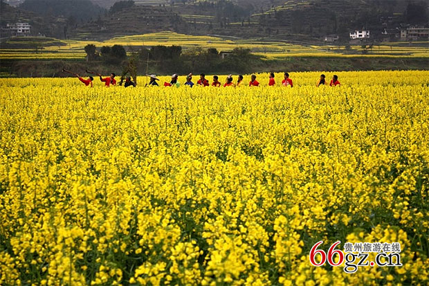 开阳十里画廊旅游区位于开阳县禾丰乡和南江乡境内,沿河有民风淳朴、依山傍水的十多个自然村寨。从马头寨俯瞰禾丰底窝坝,青龙河在此处伸了一个优美的懒腰绕坝流过。春季,田野里尽是层层叠叠、漫山遍野灿烂的油菜花和山腰羞涩的粉色桃花、白色梨花,整个田坝在青龙河的包围下形似盆而色金黄,故名“玉水金盆”。水流盘绕着漫山遍野金黄色的油菜花海,掩映着木楼灰瓦,使得每一个逃离纷繁城市的人都能找到归宿。