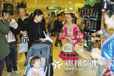 近日,德国考夫霍夫(kaufhof)超市的茶叶销售区热闹非凡。6名身着贵州传统少数民族服饰的姑娘在这里表演以“多彩贵州”为主题的少数民族舞蹈,吸引了德国消费者的关注和喝彩。在表演间隙,她们以精湛的茶艺为德国消费者奉上一杯杯栗香浓郁的绿茶。原来,她们是贵州贵茶有限公司的专职表演团队,不远万里来到德国,为“绿宝石”绿茶的上架销售表演助兴。观看原生态的贵州舞蹈表演,品饮原生态的贵州茶叶,让德国消费者不能不为之倾倒。这群来自贵州高原的访客,将在长达一个半月的时间里,到考夫霍夫众多连锁超市进行巡回演出。她们将中国源远流长的茶叶文化,以及来自贵州茶叶的问候,传播到德国各地。