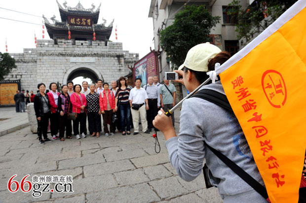 图为一名贵州导游在为游客集体拍照。(吴东俊 摄影)