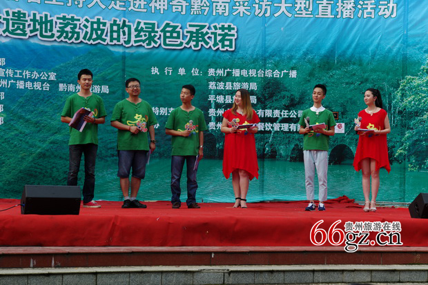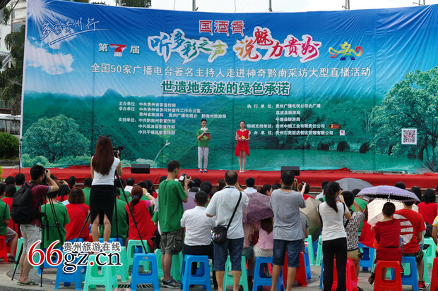 “听多彩之声 说魅力贵州”全国50家广播电台著名主持人走进贵州大型直播活动已经举办七年了,七年的脚步同行,让贵州的山水间流淌着全国广播名嘴的欢声笑语,留下了他们轻盈的脚步。今天,他们来到了黔南布依族苗族自治州,来到了神奇的南方喀斯特世界自然遗产地——荔波,向广大受众宣传“地球腰带上的绿宝石”的迷人风采。大型直播现场,名嘴主持们用简洁而风趣语言,像广大听众介绍了荔波名字的由来、李博的历史、经济和文化,语言不乏诙谐幽默,不是赢得观众阵阵掌声。