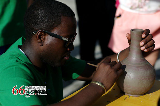 中国国际广播电台俄东中心主持人默赛斯在牙舟陶瓶上绘画。