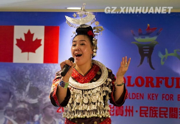 在加拿大安大略省尼亚加拉湖镇,来自贵州的表演者在活动开幕式上演唱民歌。新华社发(邹峥 摄)