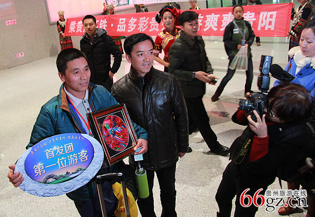 (贵州省旅游局余泠副局长给首发团第一位游客黄先生赠送礼物并合影)