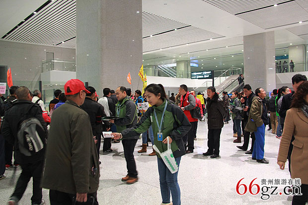 今日,在省市旅游的领导下,快行漫游与贵州省其他旅游企业工作人员一道赶赴贵阳贵阳北站做迎接高铁首发团的准备工作。为迎接此次贵广高铁首发日团队游客的到来,快行漫游的工作人员提前准备制作了接站横幅、装有纸巾、湿巾、贵州旅游地图、贵州特产的礼品袋等免费赠送给高铁首发日团队游客,更有多彩贵州风演员在出站口现场为高铁游客表演代表贵州特色的民族歌舞,对他们的到来表示热烈的欢迎和诚挚的祝福。首发团第一位游客黄先生更是同时接到了来自省市旅游局领导和快行漫游送出的精美礼品。