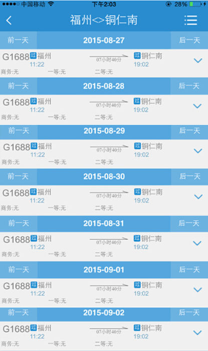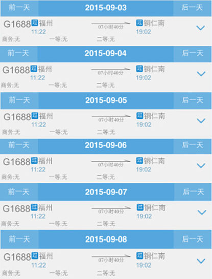 福州到铜仁南的近半个月内,12306购票网上均显示无票