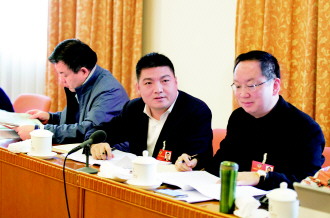 全国政协委员林积灿(中)在政协会议青联界别小组讨论会上与同组委员热议《政府工作报告》。旷光彪 摄