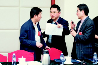 我省全国政协委员陆洪光(中)在政协会议医卫界别小组讨论会间隙与同组委员交流。旷光彪 摄
