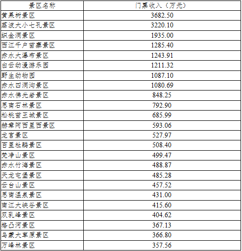 主要旅游景区(点)接待情况。纳入贵州省84个重点监测的84个旅游景区,共接待游客1373.766万人次,综合收入81.62亿元,其中景区门票收入2.84亿元。日均接待超过2万人次的景区36个,累计接待游客20万人次以上的景区20个。
