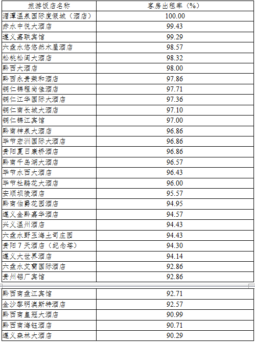 旅游饭店接待情况。全省各主要旅游集散地和旅游热点城市星级酒店入住率高居不下,经济型酒店和社会旅馆入住率保持高位。据全省102家重点监测的饭店统计,平均出租率达74.3%。其中湄潭温泉国际大酒店、赤水中悦大酒店、遵义嘉联宾馆等31家酒店入住率达90%以上;黔西南金州翠湖宾馆、安顺凯旋酒店等20家酒店入住率达80%以上;黔西南黔山度假酒店、贵阳丽豪酒店等18家酒店入住率达70%以上。