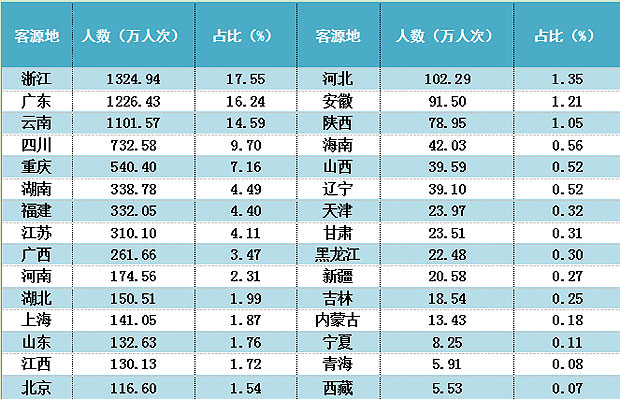 一是入黔国内游客快速增长,客源结构加快调整。据统计,2017年1-3月全省共接待外省游客7549.64万人次,占国内游客总数的52.2%,同比增长31.3%。从客源变化趋势来看,浙江一举超过广东,成为我省客源第一大省份,占入黔游客的17.5%。广东占入黔游客的16.2%,退居第二位,这是继贵广高铁开通后,广东超过四川以后,又一次新变化。外省第一大客源地从西部邻省变为珠三角、长三角,客观反映出贵州旅游影响力在空间区位的发展趋势。