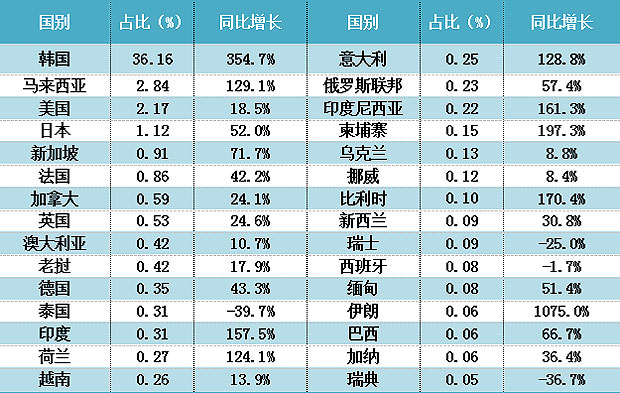 另一方面,过夜入境游客增长势头迅猛。2017年1-3月全省住宿单位共接待过夜入境游客7.33万人,同比增长54.2%。其中,港澳台地区在黔过夜游客占比超过4成,达3.35万人;过夜外国游客数量比同期增长1倍以上,韩国入境游客同比增长达354%。