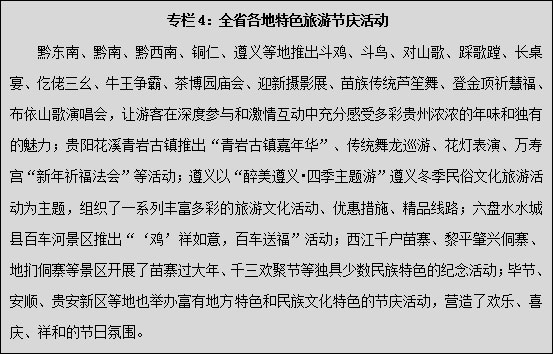二是特色节庆活动进一步增强我省旅游吸引力。全省各地突出“山地公园省·多彩贵州风”形象品牌,坚持文化、生态、旅游深度融合,举办一系列年味十足的民俗节庆活动100余项,为入黔旅游者呈上了一场场享民俗、增年味、添游兴的文化盛宴,吸引海内外游客“到贵州过大年”。